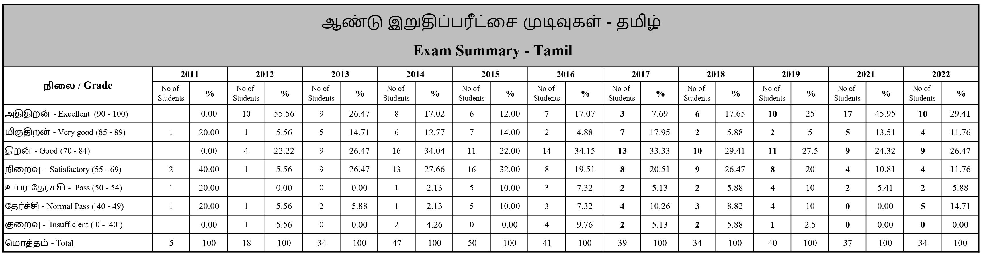 | No of Students / மாணவர்களின் எண்ணிக்கை | % | No of Students / மாணவர்களின் எண்ணிக்கை | % | No of Students / மாணவர்களின் எண்ணிக்கை | % | |